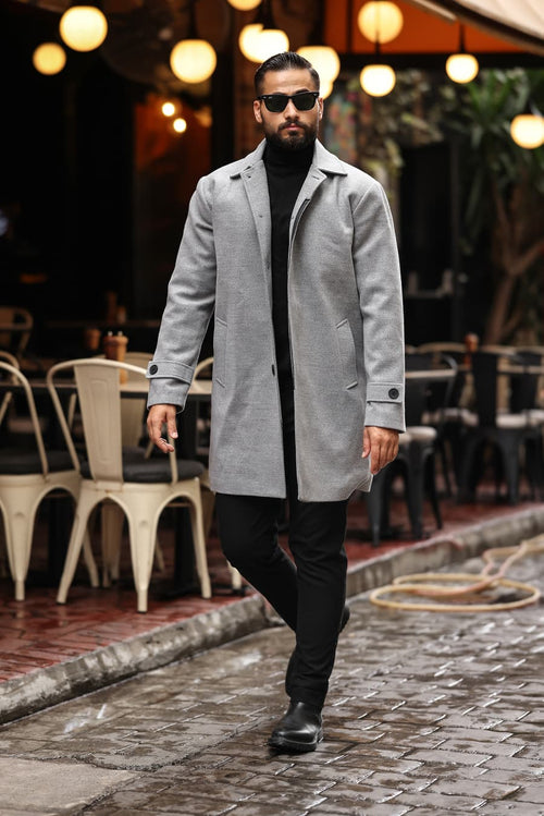 Bebe Yaka, Gizli Düğmeli, Kolda Apoletli Erkek Gri Kaşe Kaban - Kod:2501 -