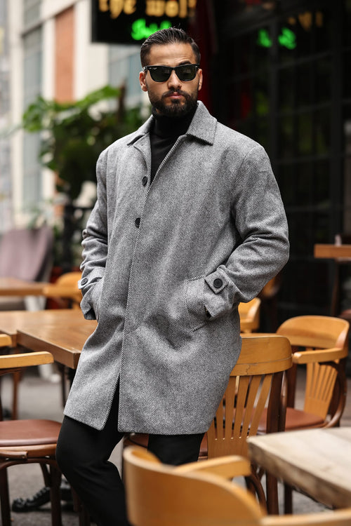 Bebe Yaka, Gizli Düğmeli, Kolda Apoletli Erkek Balıksırtı Gri Kaşe Kaban - Kod:2501 -